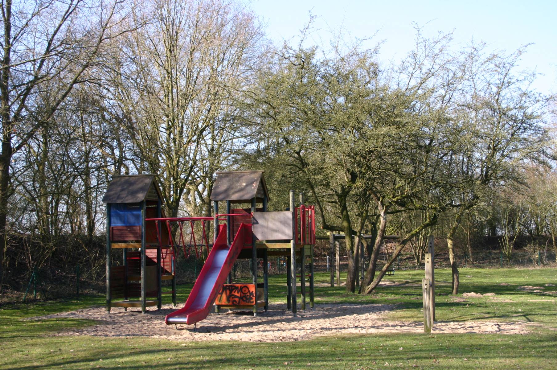 Der Kinderspielplatz in Achim ist ein sicherer und umzäunter Ort für Kinder, um zu spielen und sich auszutoben. Er bietet eine Mischung aus alten und neuen Spielgeräten, darunter ein großes, modernes Spielgerät mit vielen Möglichkeiten. Die Lage an einer Nebenstraße sorgt für eine ruhige Atmosphäre, ideal für Familien. Allerdings gibt es einige Mängel, wie einen überfüllten Papierkorb und Müll auf dem Gelände, die den Gesamteindruck trüben. Väter können am Wochenende entspannt Fußball schauen, während die Kinder spielen.
