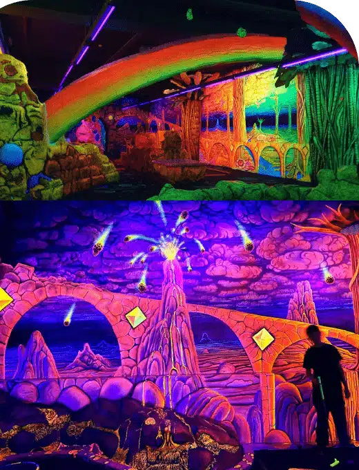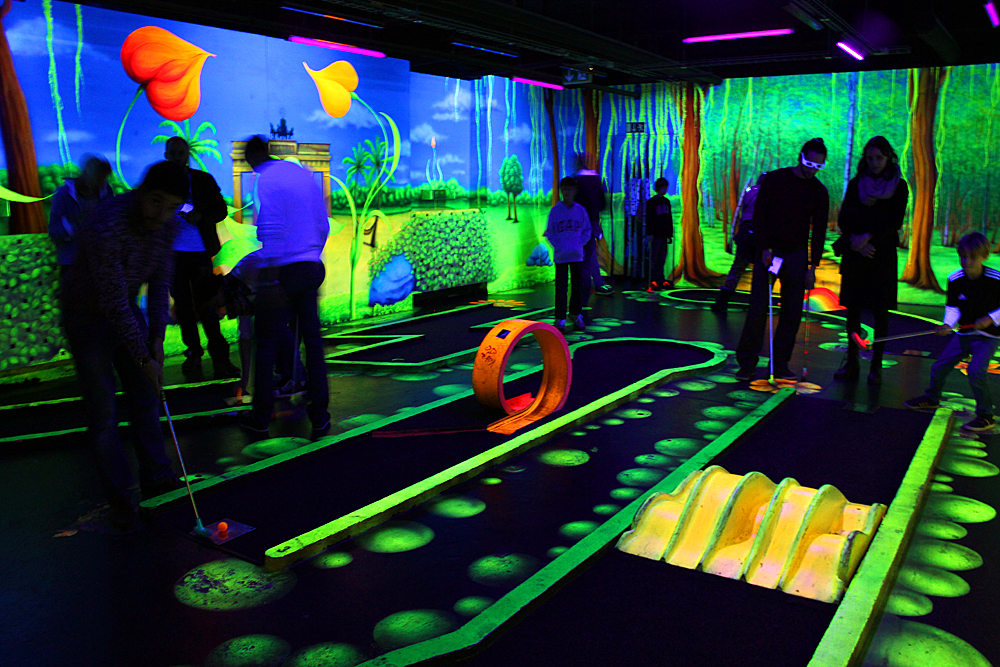 Das 3D Schwarzlicht-Minigolf in Berlin bietet ein einzigartiges und kinderfreundliches Erlebnis. Die Anlage ist kreativ gestaltet und sorgt mit beeindruckenden 3D-Effekten für viel Spaß. Ideal für Familien, gibt es eine Spielecke für die Kleinen und ein Café für Snacks und Getränke. Die Bahnen sind abwechslungsreich und bieten Herausforderungen für alle Altersgruppen. Trotz gelegentlicher Wartezeiten an der Getränkebar ist der Aufenthalt angenehm und die Atmosphäre lebhaft. Ein echter Geheimtipp für einen unterhaltsamen Tag im Tempelhofer Hafen.
