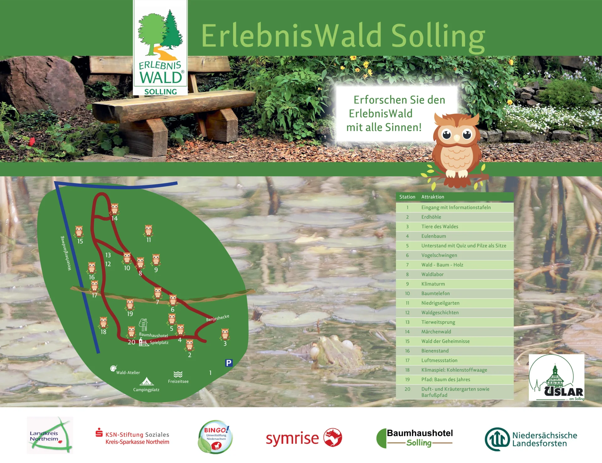 Der Erlebniswald Solling in Uslar ist ein kinderfreundlicher Ort, der Familien zahlreiche spannende Aktivitäten bietet. Mit einem beeindruckenden Aussichtsturm, einem Märchenwald und einem Niedrigseilgarten ist er ideal für einen erlebnisreichen Tag in der Natur. Infotafeln entlang des Rundwegs sorgen für lehrreiche Momente, während die liebevoll gestalteten Baumhäuser und der Kräutergarten zum Entdecken einladen. Der Barfußpfad bietet ein besonderes Erlebnis für die Sinne. Ein perfekter Ort für Kinder und Erwachsene, um gemeinsam Zeit in der Natur zu verbringen.