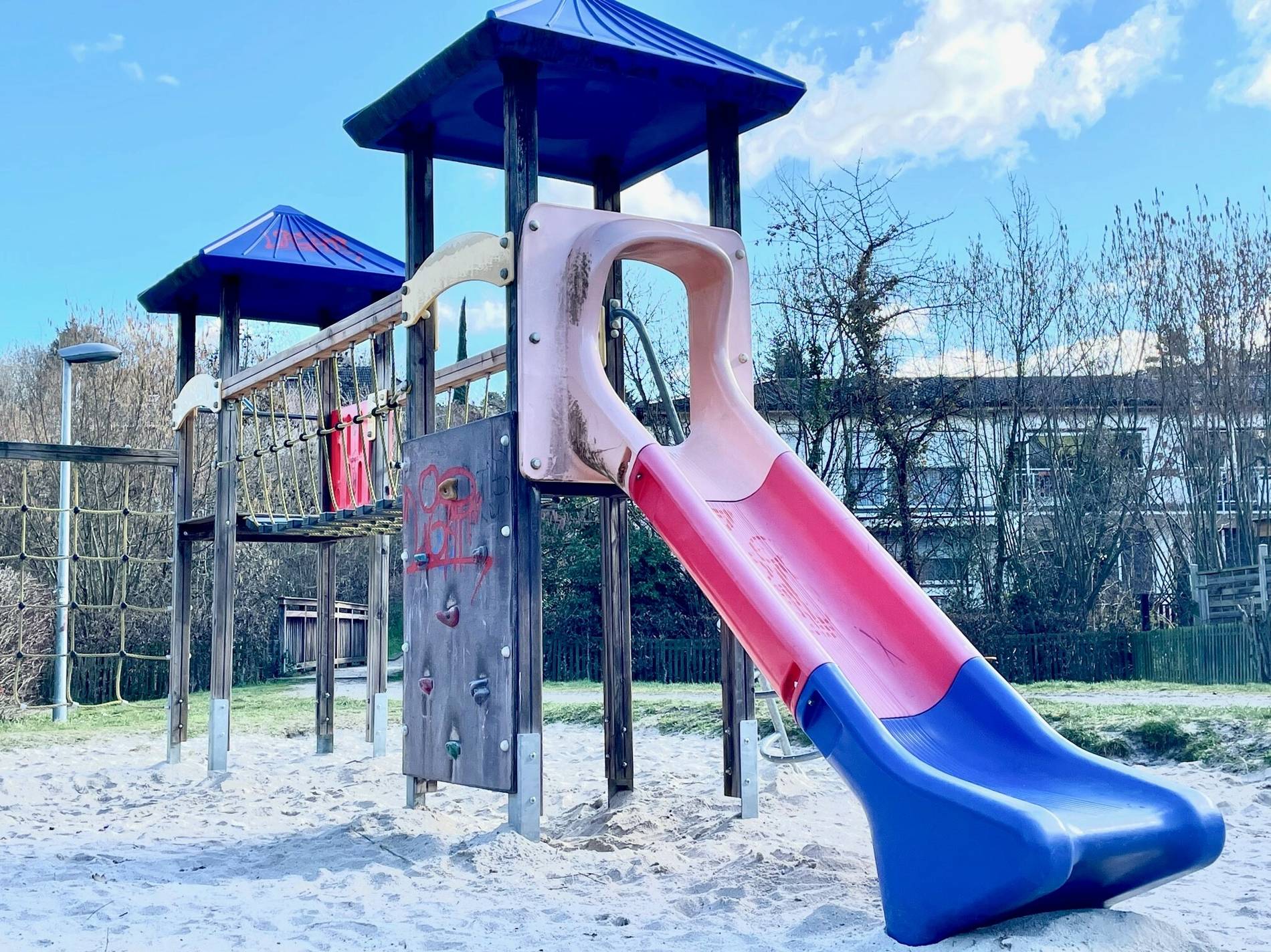 Der Spielplatz Mehlemer Straße in Wachtberg ist ein kleiner, kinderfreundlicher Ort, der sich gut für Kinder ab 28 Monaten eignet. Die Spielgeräte sind in Ordnung und fördern die Feinmotorik älterer Kinder. Die Lage ist schön, jedoch gibt es einige Herausforderungen, wie die häufige Verschmutzung durch Hunde und das Fehlen von Schatten im Sommer. Zudem fehlt eine Schaukel, und Fahrradfahrer nutzen die angrenzende Straße oft mit überhöhter Geschwindigkeit. Insgesamt ist es ein schöner Spielplatz, der jedoch mehr Pflege benötigt.