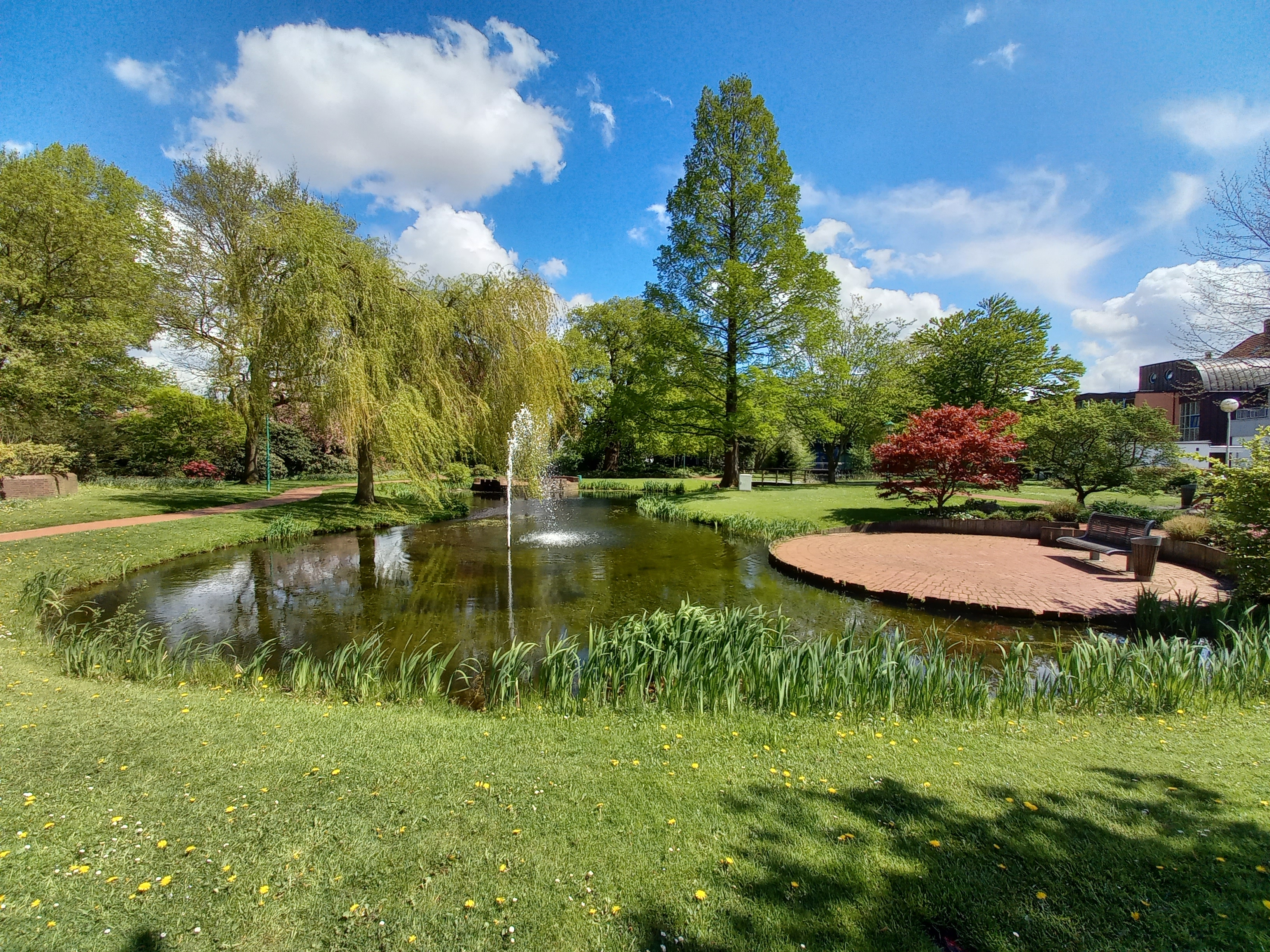Der Stadtpark Thalenweide in Westerstede ist ein kleiner, aber ruhiger Rückzugsort im Stadtzentrum. Umgeben von großen alten Bäumen, bietet der Park eine Holzbrücke, eine Wasserfontäne und mehrere Skulpturen. Der Teich beherbergt verschiedene Fische und eine Schildkröte, was ihn besonders für Naturfreunde attraktiv macht. Der Park ist ideal zum Entspannen und Verweilen, auch mit einem Buch aus der nahegelegenen Bibliothek. Trotz seiner kleinen Größe ist der Park gepflegt und lädt zu einem Besuch ein.