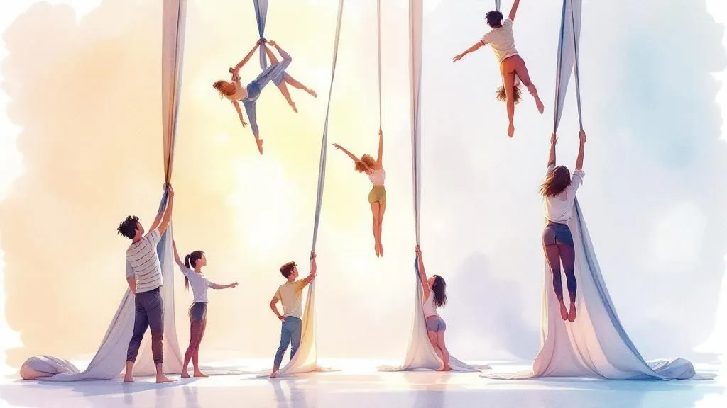 Du wolltest schon immer mal wie Zirkusartisten durch die Lüfte fliegen? In diesen intensiven Luftakrobatik-Workshops lernst du, wie das an einem Vertikaltuch geht! Nach einem kräftigenden Warm-up...