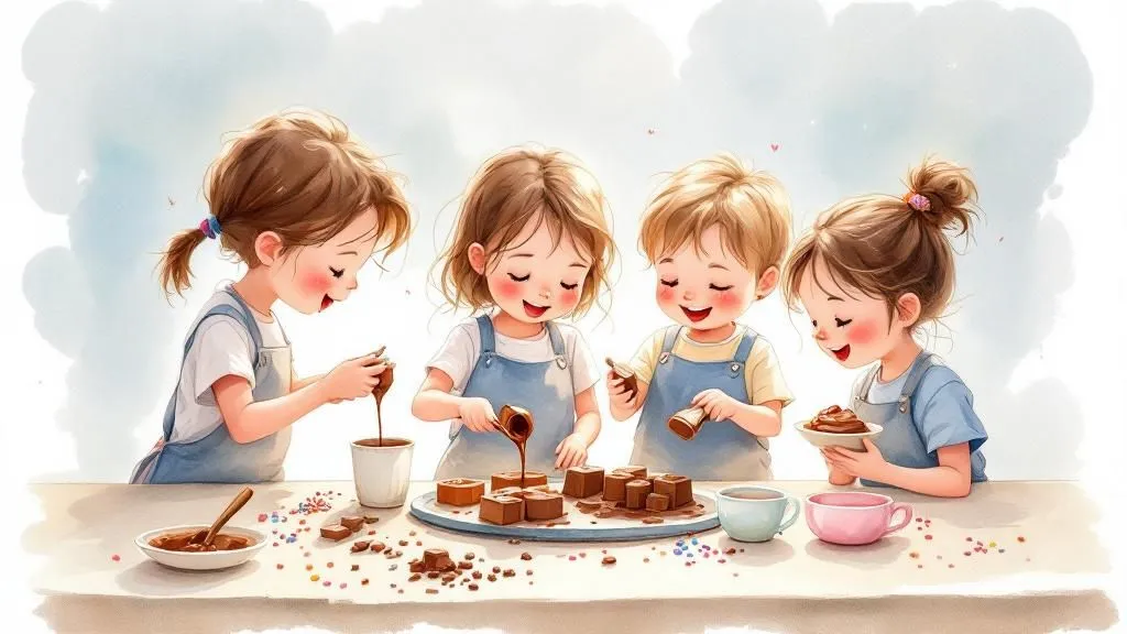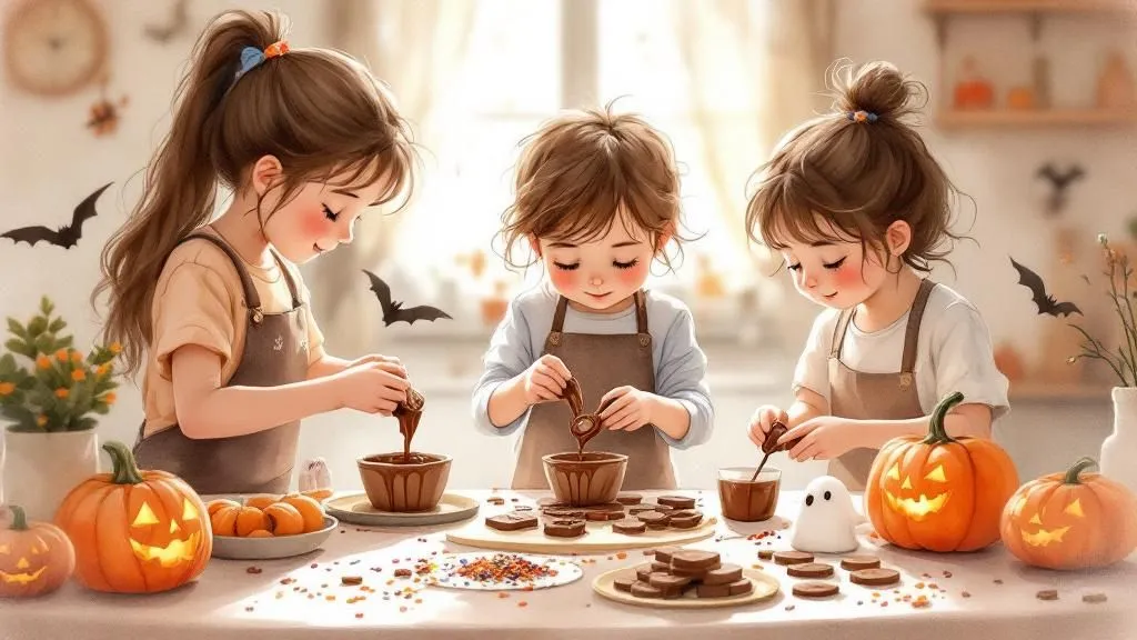 Stelle deine eigenen Schokoladentaler, Schokoladentafel und Schokoladenlollis her, indem du die zwei verschiedenen temperierten Schokoladen aufgießt und mit Gestern, Kürbissen & Zuckerstreusel aus...