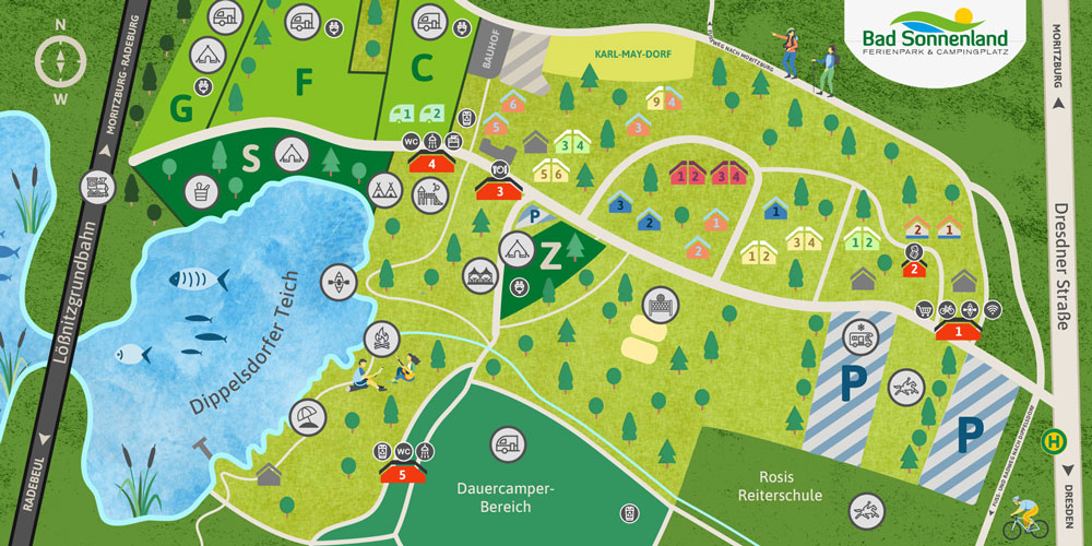 Bad Sonnenland ist ein kinderfreundlicher Ferienpark mit Campingplatz in Moritzburg, ideal für Familien und Naturliebhaber. Die Anlage bietet komfortable Maxi-Bungalows, die gut ausgestattet und vorgeheizt sind. Ein schöner Spielplatz und die ruhige Umgebung laden zu Aktivitäten im Freien ein. Die sanitären Einrichtungen sind sauber und beheizt, und es gibt einen Kiosk sowie einen Brötchenservice. Der Platz ist ein ausgezeichneter Ausgangspunkt für Erkundungen rund um das Schloss Moritzburg und bietet auch im Winter eine angenehme Atmosphäre.